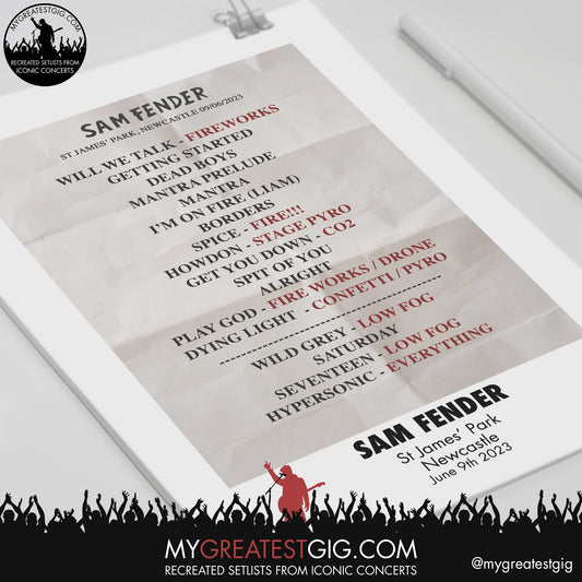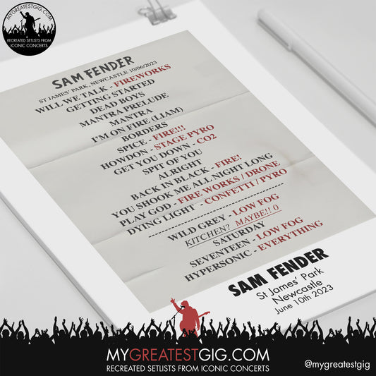 Sam Fender - Newcastle - June 9th 2023 Recreated Setlist Poster