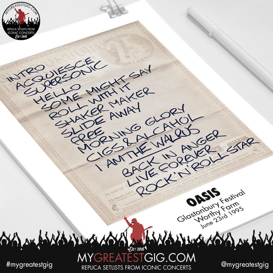 Oasis - Glastonbury Festival - Jun 23rd 1995 Recreated Setlist Poster