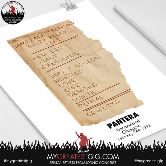 Pantera - Barrowland - February 14th 1993 Replica Setlist Poster