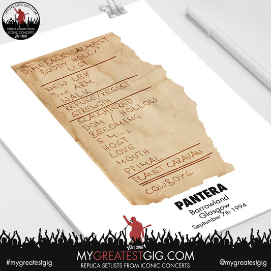 Pantera - Barrowland - September 7th 1994 Replica Setlist Poster