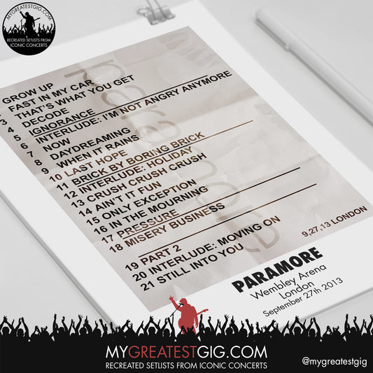 Paramore - Wembley Arena - September 27th 2013 Recreated Setlist Poster