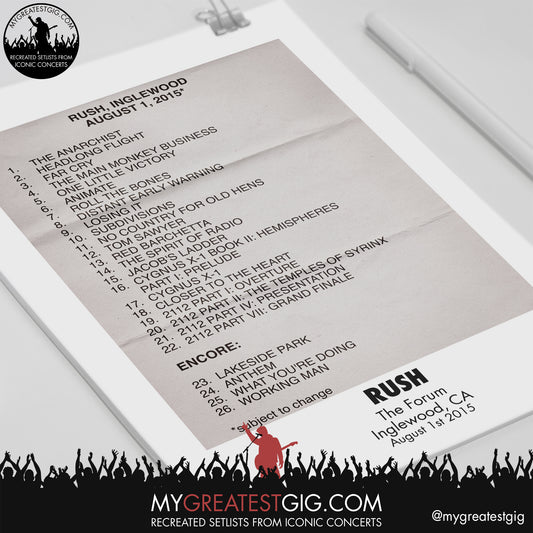 Rush - Inglewood - August 1st 2015 Replica Setlist Poster