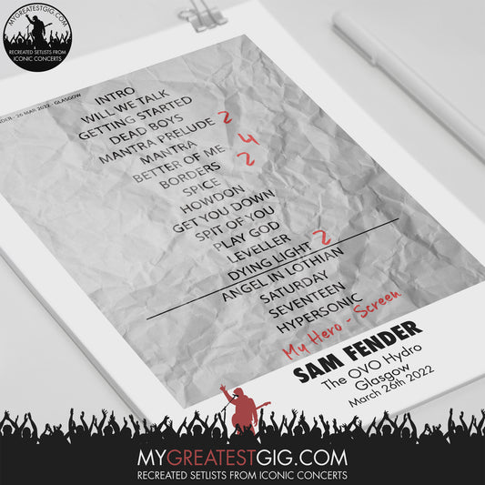 Sam Fender - Glasgow - Mar 26th 2022 Recreated Setlist Poster