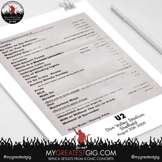 U2 - Sheffield - August 20th 2009 Replica Setlist Poster