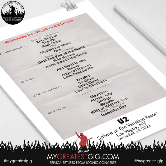 U2 - Las Vegas - December 6th 2023 Replica Setlist Poster