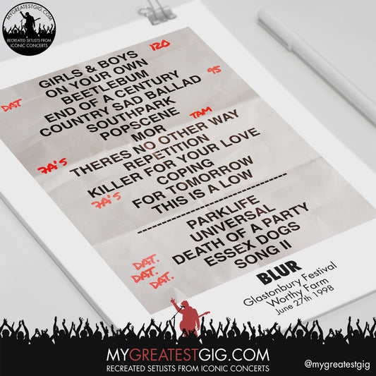 Blur - Glastonbury Festival - June 27th 1998 Recreated Setlist Poster