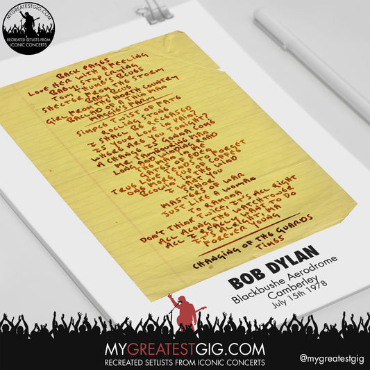 Bob Dylan - Camberley - July 15th 1978 Recreated Setlist Poster