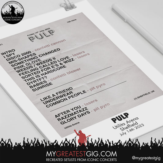 Pulp - Sheffield - July 14th 2023 Recreated Setlist Poster