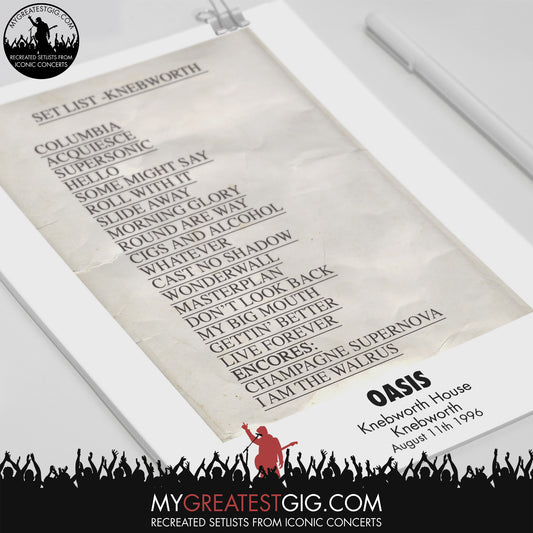 Oasis - Knebworth - Aug 10th 1996 Recreated Set List Poster