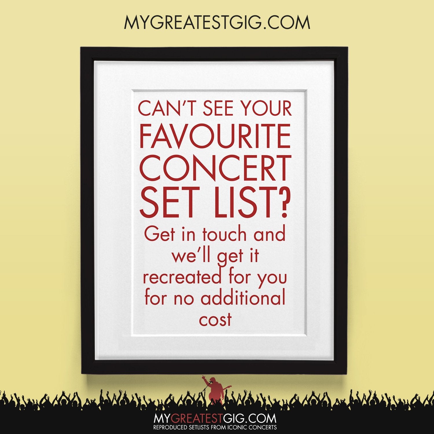 Please note these prints are reproductions, we have recreated the Set List featuring every song played at the gig and mocked up a copy to give an authentic look of ink and print on aged paper.