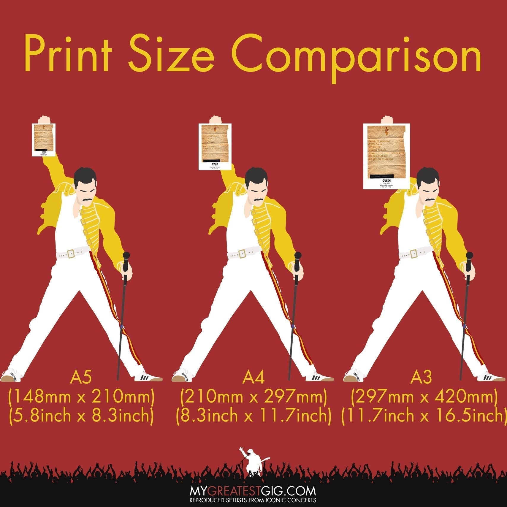Please note these prints are reproductions, we have recreated the Set List featuring every song played at the gig and mocked up a copy to give an authentic look of ink and print on aged paper.