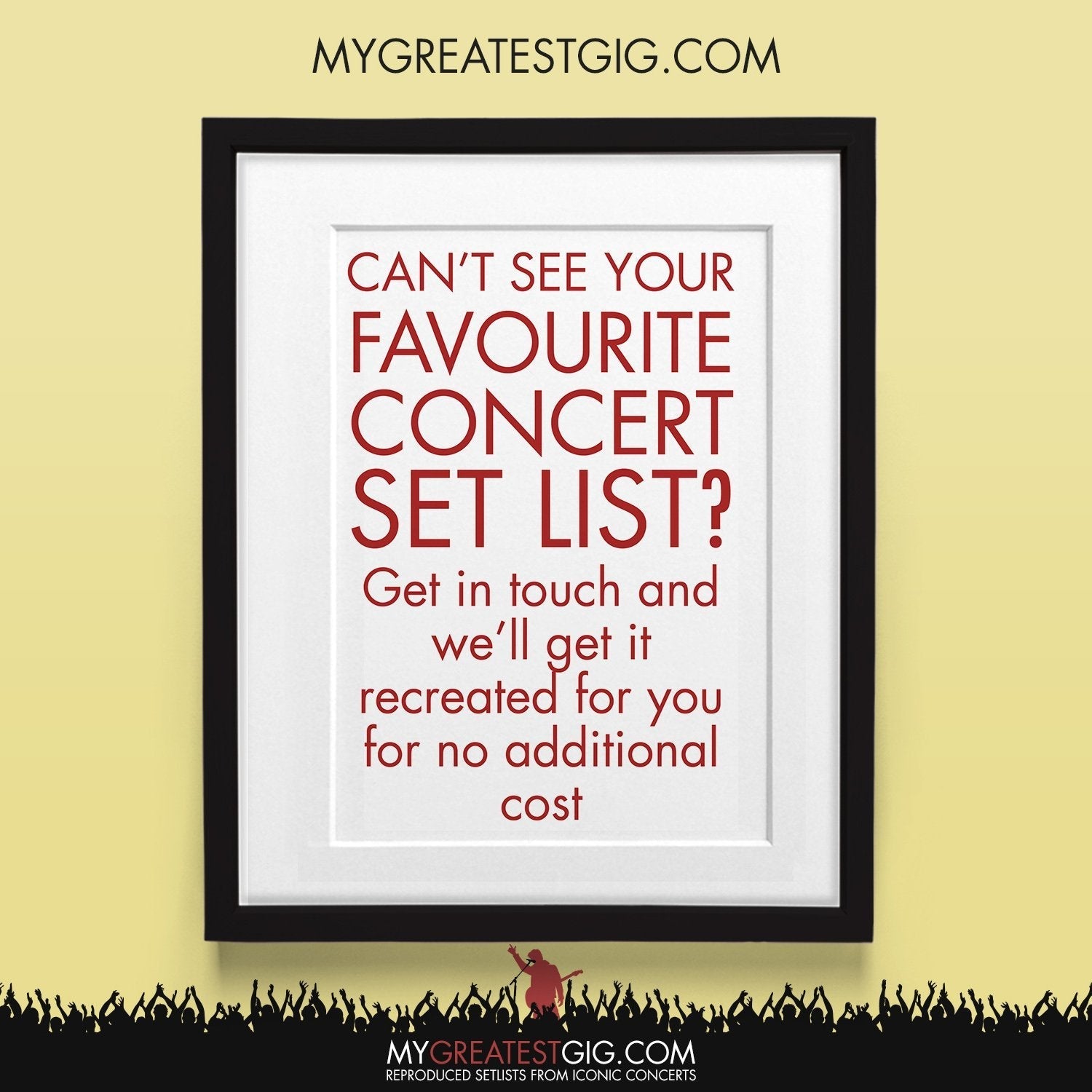 • Don't see your favourite gig listed? Just let us know who and where and we can get something designed just for you, please get in touch.