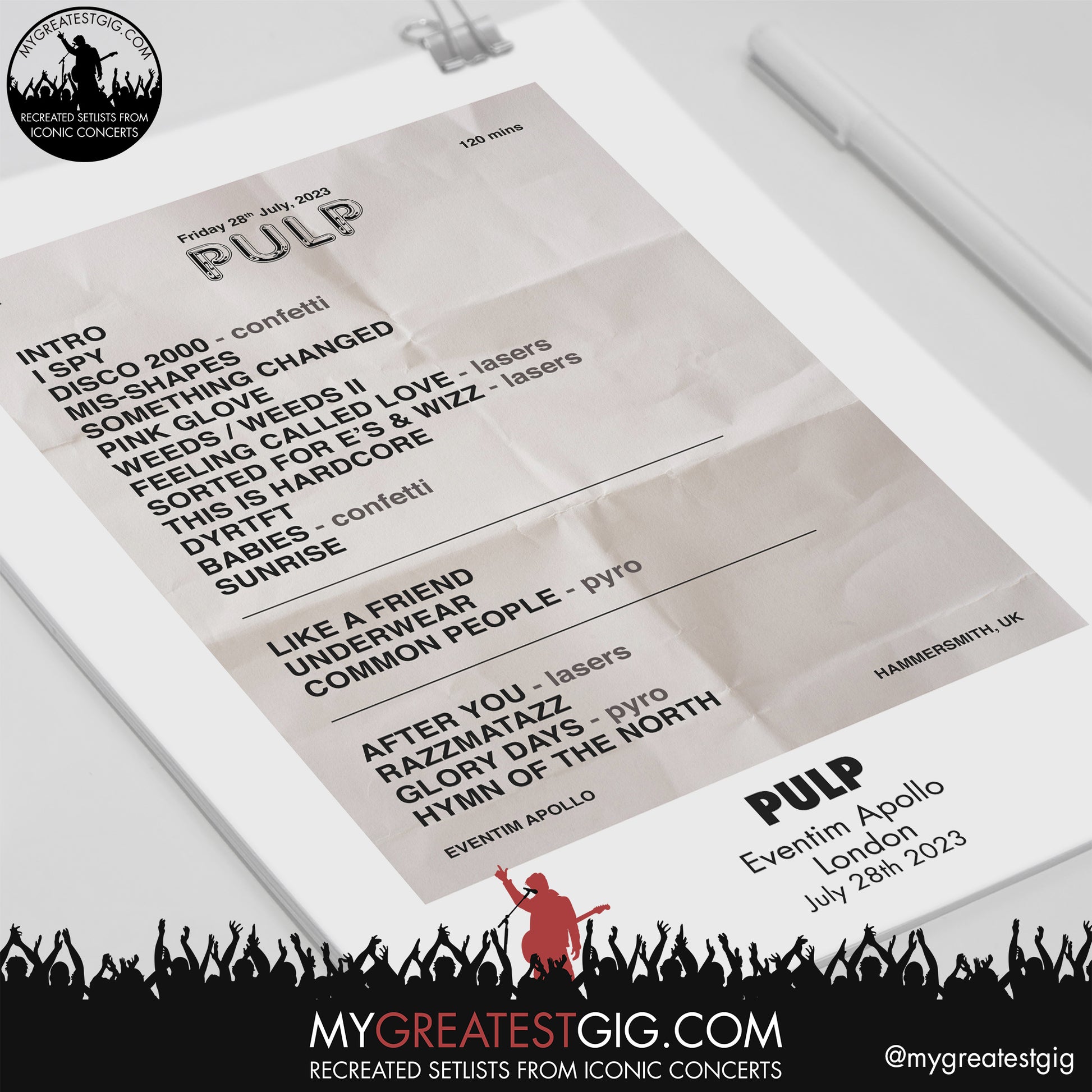 A Recreated Set List from the Pulp Apollo gig 2023 28th July