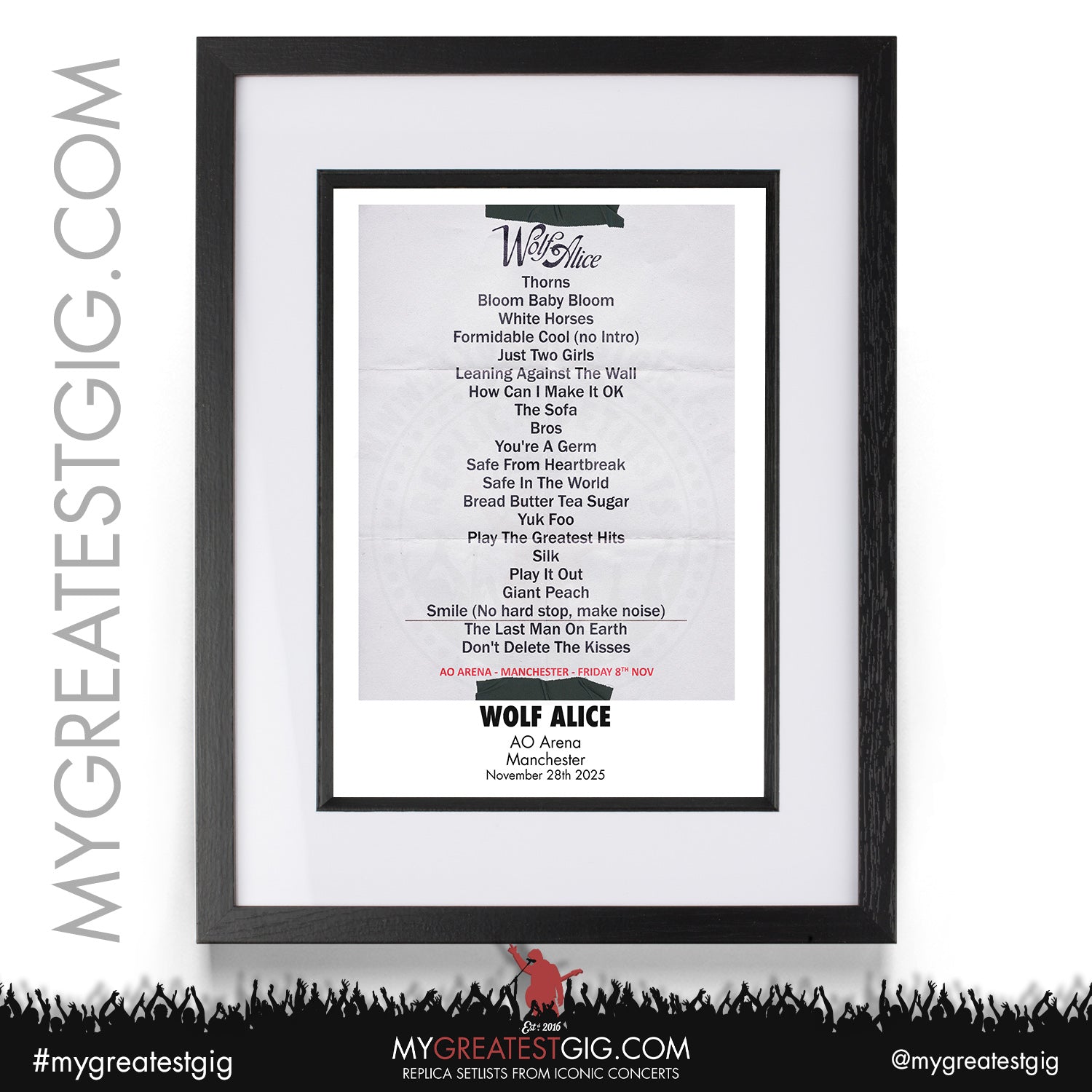 Every setlist is meticulously researched to match the real running order of the show—right down to the details—creating a faithful, frame-worthy replica from Wolf Alice’s The Clearing tour.